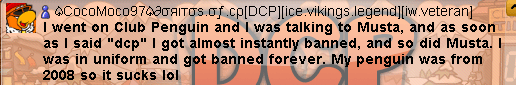 As many of you know, or if you didn’t know, Club Penguin is starting to ban people forever for recruiting on CP. I highly advise you all don’t recruit until said to by me or Mustapha. Here is proof that we are getting banned for recruiting: