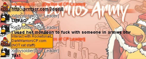 Now that it has been made clear that Toysoliders’ notorious alias is Sanity, we can confirm that Toysoldier has denied access of the internet to tens of people including many known figures in this community such as Spi101, Step, Jester, the entire current ownership here in DCP, and much, much more. Anyone who still doubts it is simply ignorant. Prove me wrong as to how he didn’t DoS people within the leadership of Doritos other than the idiocy that came from a few DW troops such as “DW had an event during DCP’s event”… Newsflash for the 5 year olds in DW: It doesn’t take a neuropsychologist to press “launch attack” while playing Club Penguin.