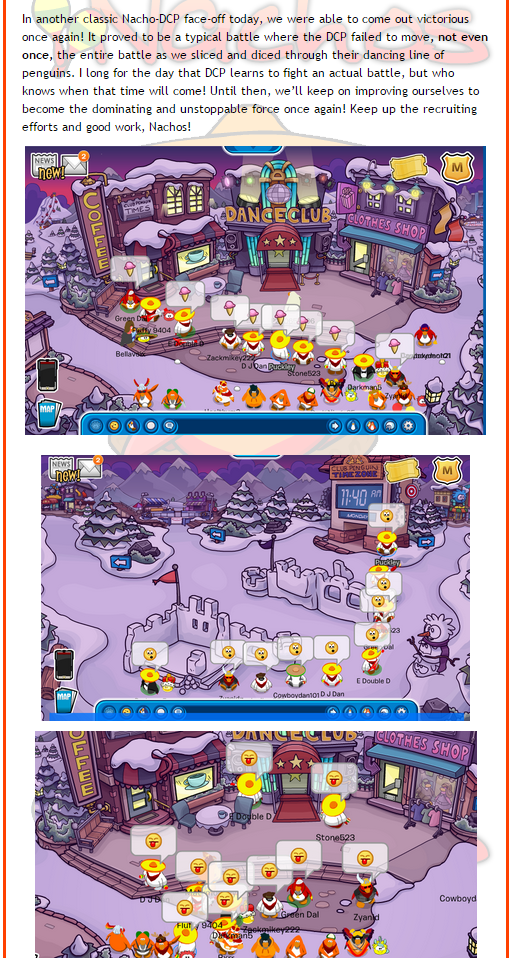 Recently, a Nacho legend known as Puckley made a post about our recent UK battle. He only included pictures of DCP before we even logged on. And he claimed that we didn’t do any bombs, and because of that, they win. Which is extremely pathetic and simply weird. But in DCP’s post, it shows our actual battle sizes, that he tried to hide. It also shows evidence of DCP performing bombs against the Nachos. Meaning his excuse for victory is invalid.
